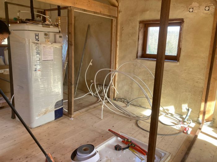 Je suis à plein temps sur le chantier en accueil permanent et il y a toujours quelque chose à faire. La maison en est au stade du second-oeuvre/finition et des aménagements extérieurs, style terrasse et sauna traditionnel.