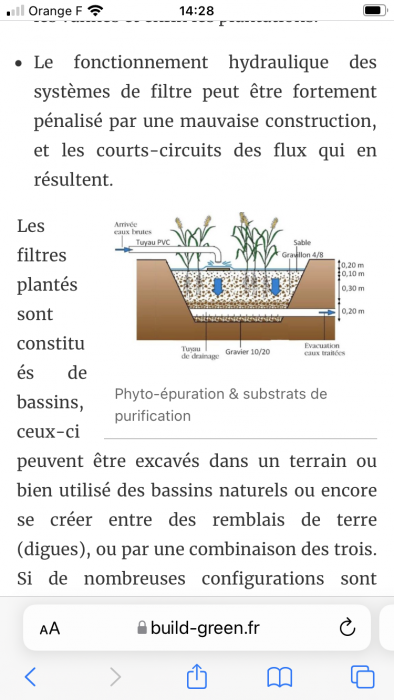 La phyto existante était sur le concept de filtration par bac plantés (roseaux et iris) et par filtration de l’eau horizontale. Nous allons ajouter deux bacs de 1000L avant les 3 bacs existants (quasi deux fois plus grande puisque les bacs existants sont des bacs de 600L) sur un système de filtration horizontal. Nous prévoyons la semaine car il faut creuser un peu pour mettre les bacs de niveau, remplir les bacs des différents éléments, creuser une tranchée depuis la pompe de relevage jusqu’à la buse de dérivations des eaux.