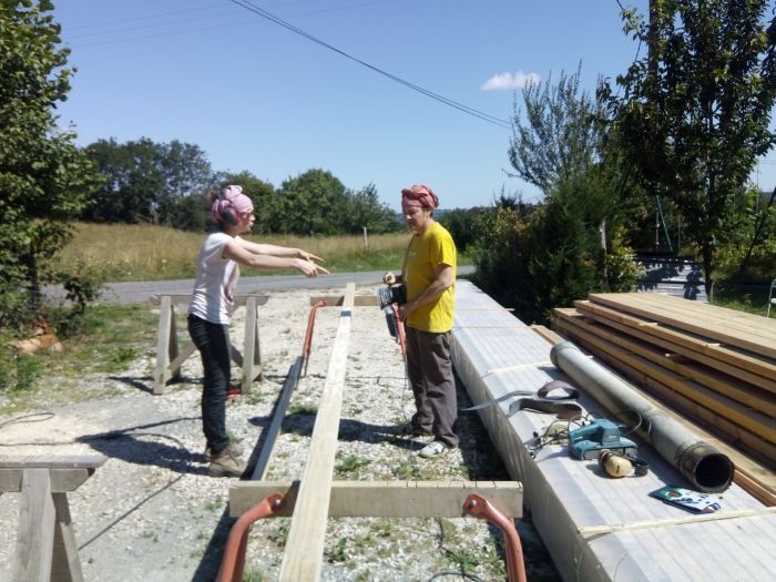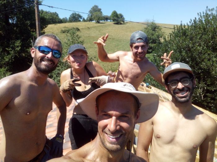 Le premier chantier participatif s'est déroulé en juillet-aout dernier. L'objectif a été atteint grâce à toutes les énergies des volontaires passés par là!!! Big up à tous! Le toit est terminé: du parement intérieur à la tuile en passant par l'isolation!