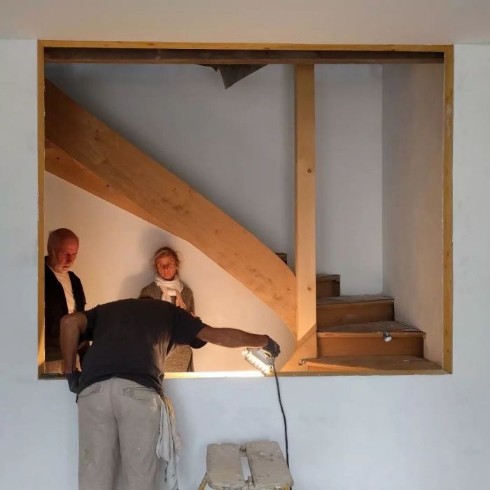 Nous sommes au second oeuvre, il reste une baie vitrée à poser, un verre sur le pignon, un escalier balancé en chêne est en cours de finition : il reste la crémallière à tailler, le stylobate à poser, l’habillage des murs est en cours : il reste du fermacell à poser, des enduits de finitions à faire, toutes les portes à poser, le plancher de l’étage, la création et réalisation de rangements en bois, l’électricité.