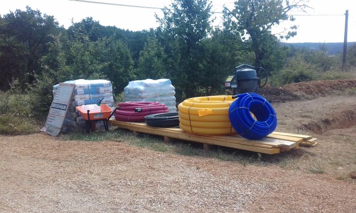 août 2023 : premiers travaux de terrassement (tranchées, mares), viabilisation (eau et électricité – compteur de chantier), toilettes sèches, montage du barnum pour accueillir les repas. FAIT