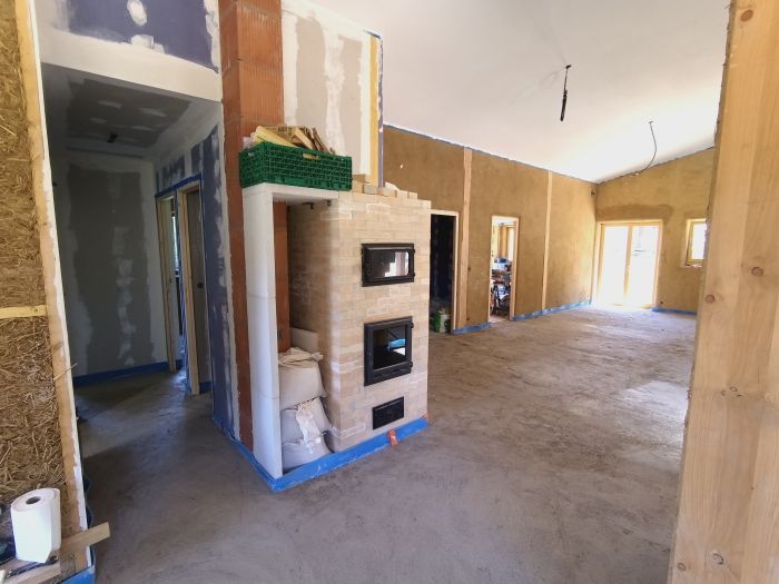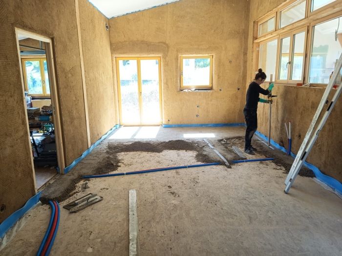 La maison aura une superficie totale d'environ 150m², où sont inclus une grande serre bioclimatique (30m²), un atelier et un cellier. Il nous reste environ 100m² "habitables".