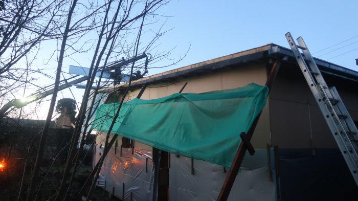 novembre : contreventement de la charpente, pare-pluie, chevrons, bâchage et protection pour l'hiver