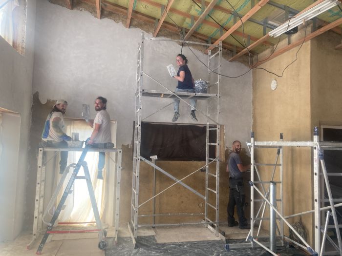Ces quatre dernières années, nous avons découvert, appris, nous nous sommes formés, trompés et nous avons rebondi, aux côtés d’auto constructeur.trices, de copain.es et de professionnel.es (formation GREB Approche Paille, auto construction d’une éolienne Piggott avec l’asso Tripalium, chantiers construction naturelle [terre paille léger/torchis thaï, enduits terre…] avec l’asso Terre Paille et Compagnie, Cours Certifiés en Permaculture, une fois encore avec les Terre-pailleux, week-end chez Patrick Baronnet et sa maison autonome…). Nous sommes par ailleurs accompagnés par deux professionnels formés Approche Paille, ils nous accompagnent dans la maîtrise d'œuvre.