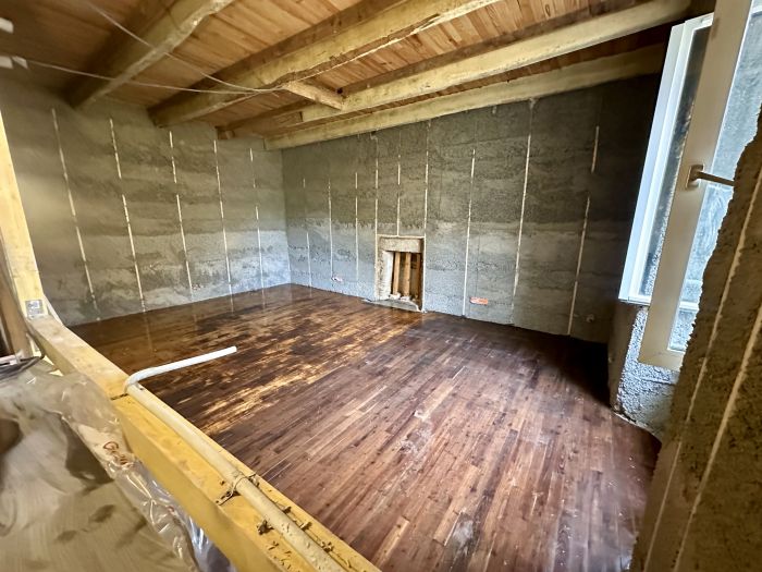 Construite en 1900, la maison fait partie d'une ancienne ferme. Elle est bâtie sur des fondations cyclopéennes avec des murs de 50 cm et une superficie au sol de 60m2. Après avoir piqué les murs extérieurs et intérieurs au rez de chaussée, je vais poser l’électricité et les tasseaux qui permettront de bancher les murs en chaux liège jusqu’à un mètre du sol puis en chaux chanvre. J’ai déjà fait un premier passage en chaux sable à l’extérieur sur deux murs sur trois (le quatrième mur donne sur une extension plus récente et ce n'est pas nécessaire)