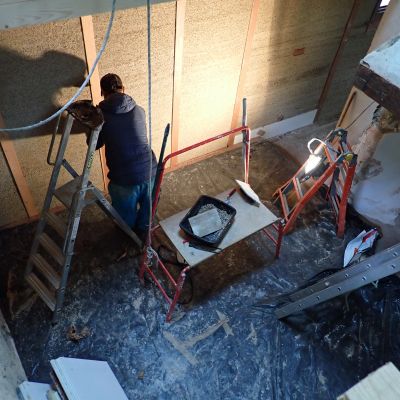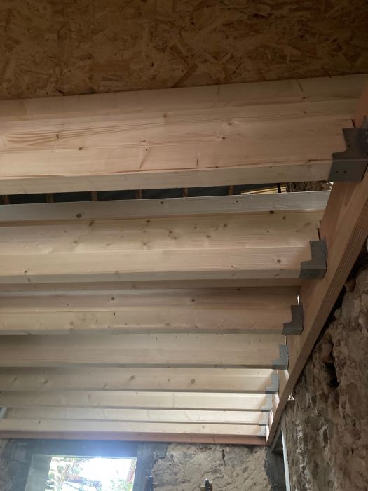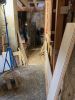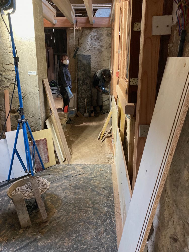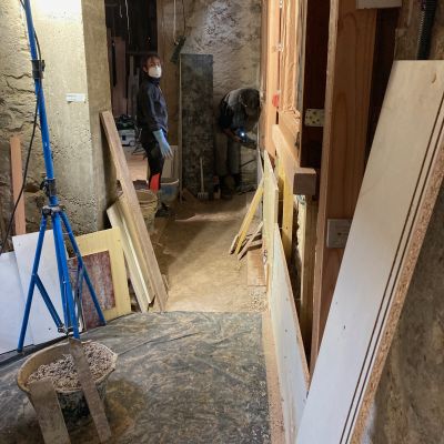 On vient de finir de démonter les planchers actuels (au plafond du chantier prévu), il nous reste à poser les réseaux et mettre en place muraillères et poutres en I, ainsi que de finir le piquage des murs en préparation du banchage.