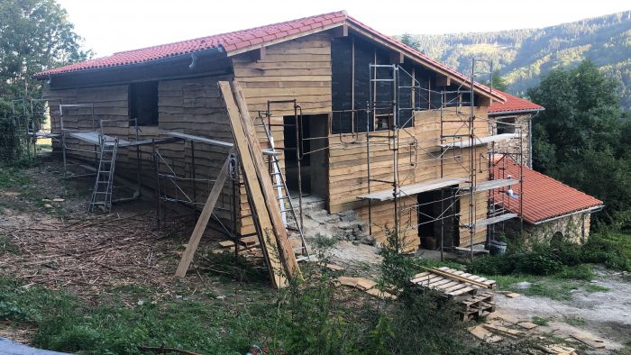 La bâtisse est une ancienne grange en pierres brutes de plus de 100 m2 au sol, dont le gros oeuvre vient d’être refait. Il s’agissaitt de procéder en deux étapes successives :