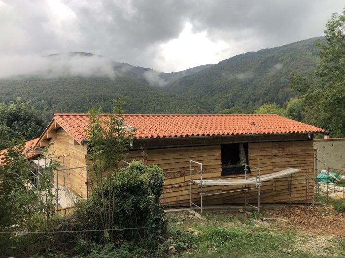 Le projet actuel est d'enrober une grange de 100 m2, en béton de chanvre banché, avec une technique que nous connaissons bien : chaux aérienne, ponce, chanvre, plâtre brut.