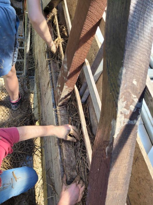 Depuis 5 ans, nous rénovons chaque année différents éléments du lieu, toujours à l’aide de personnes venues apprendre avec nous en chantier collectif. Rénovation du bâtiment du moulin (charpente, plancher, enduits à la chaux pour les murs, peinture), mise en place de base de sanitaires extérieurs pour continuer d’accueillir du monde toute l’année, rénovation d’autres bâtiments (maçonnerie, charpente, terre-paille), construction d’un espace fournil avec murs en terre-paille, construction d’une serre horticole.