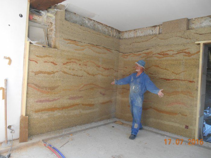 En Juillet 2016 nous avons fait la première tranche du doublage intérieur de deux murs (environ 40 m2) par la technique du banché traditionnel (Chaux Chanvre sable Terre)