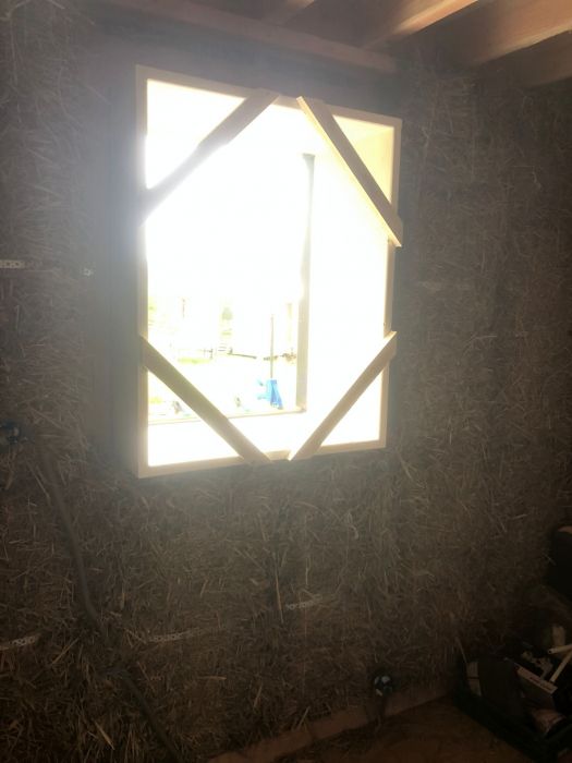 Aujourd’hui le chantier a déjà bien avancé : les murs sont levés, la charpente et la couverture posées, les menuiseries montées et l'isolation posée (paille, laine de bois, ouate soufflée). Avec l'arrivée des beaux jours, le prochain chantier se profile : enduire les murs isolés en paille avec des mélanges de terre/paille/chanvre/chaux.