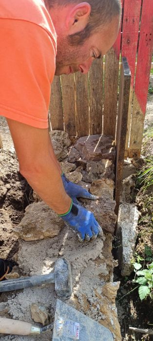-Juin à Août: (en continu) reprise des murs, changement des encadrements bois fenêtre et porte, réalisation de murs de soutènement en pierre, piquetage et enduits.