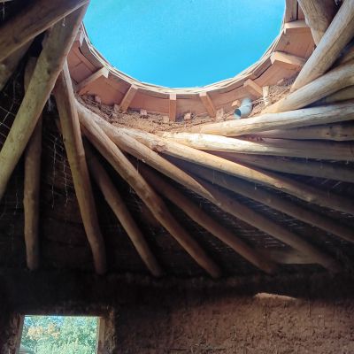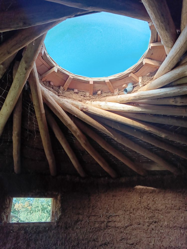 - S20-21 : écorçage des perches puis montage de la charpente réciproque et de la pergola au sud