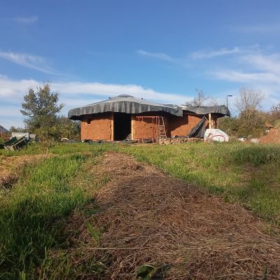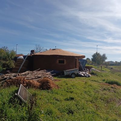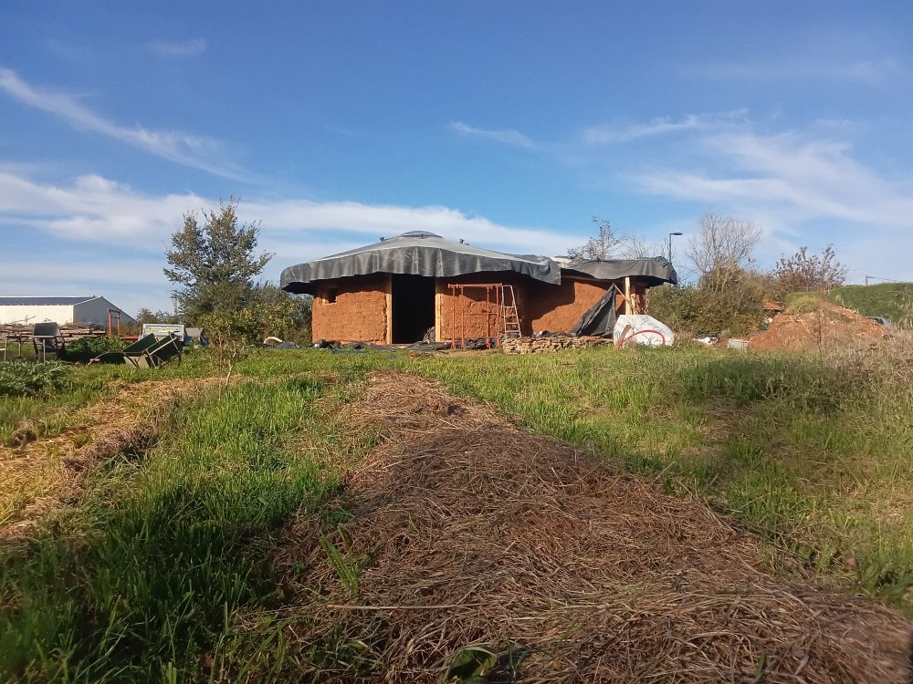 La future paillourte (maison ronde en paille porteuse avec enduits de terre et une charpente réciproque) fera 50m² avec une forme en trou de serrure, soit une grande pièce de vie ronde de 30m² et une extension de 20m² pour les 2 chambres.