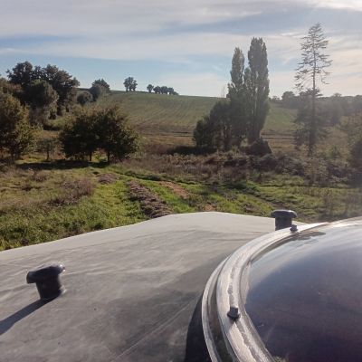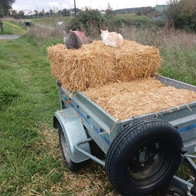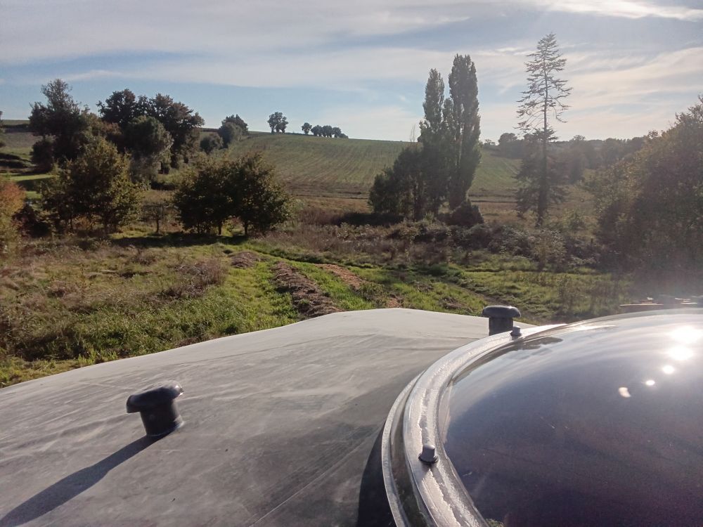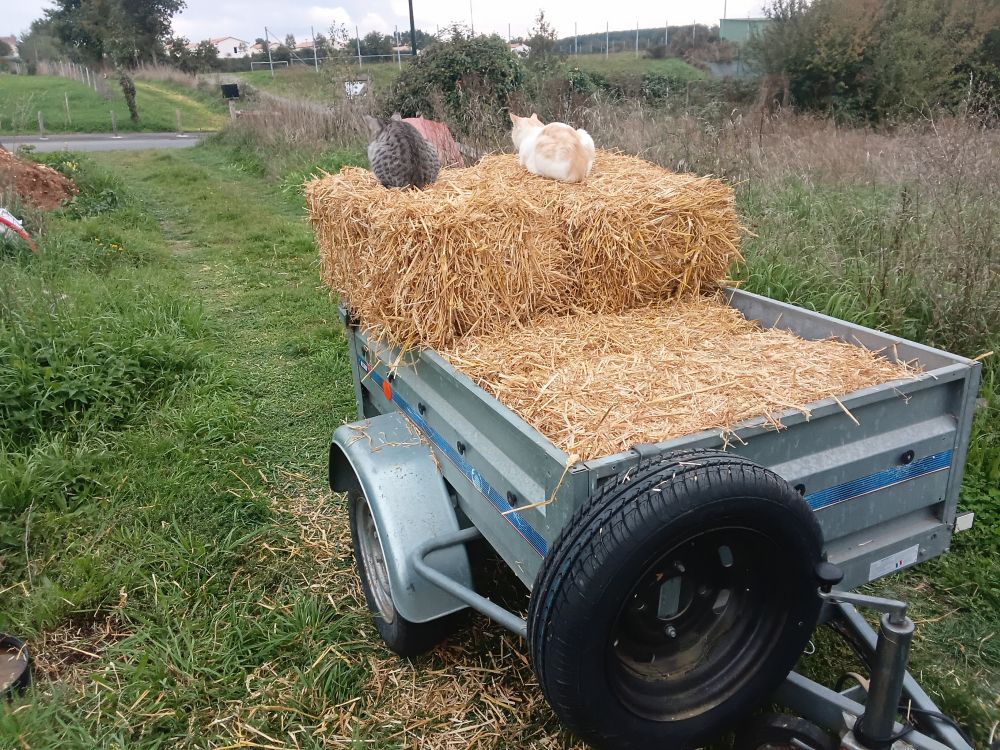 Le chantier se situe dans le bocage vendéen, en sortie de bourg d‘un petit village avec une jolie vue sur les champs vallonnés. Le terrain fait 5 000m². Aujourd’hui, il nous accueille avec notre tente de coton, deux petits chats anciennement sauvages et quelques poules pas sauvages du tout.