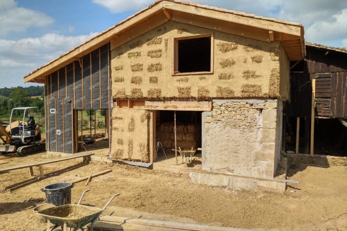 Nous privilégions des matériaux bio-sourcés, provenant de nos propres champs et forêts en utilisant les techniques de l’OSSATURE BOIS et des MURS EN TERRE-PAILLE et pierre ; ces pratiques anciennes nous invitent à de nouvelles interprétations, dans l’esprit d’une SOBRIETE (consommation locale, récupération et recyclage), et d’une AUTONOMIE non seulement constructive, mais aussi alimentaire (toilettes sèches, humus, eau potable, permaculture) et énergétique (bois de chauffage, eau chaude, électricité, isolation).