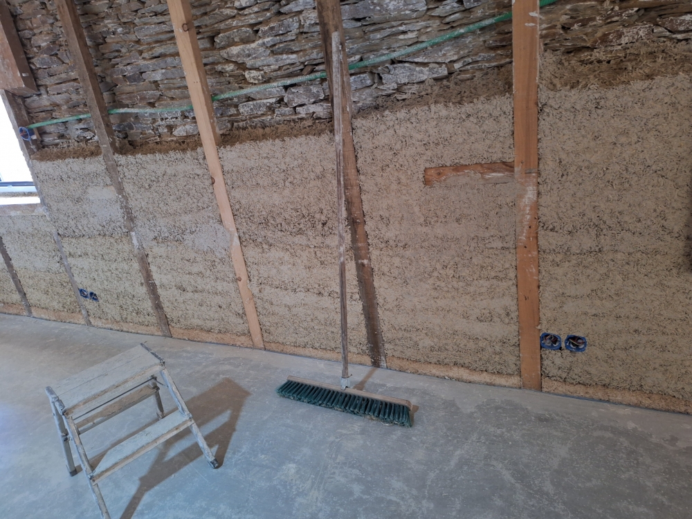 Maçonnerie pierre, béton de chaux chanvre banché, enduit de finition chaux chanvre, murs à pierre vue, isolation laine de chanvre en sous toiture...