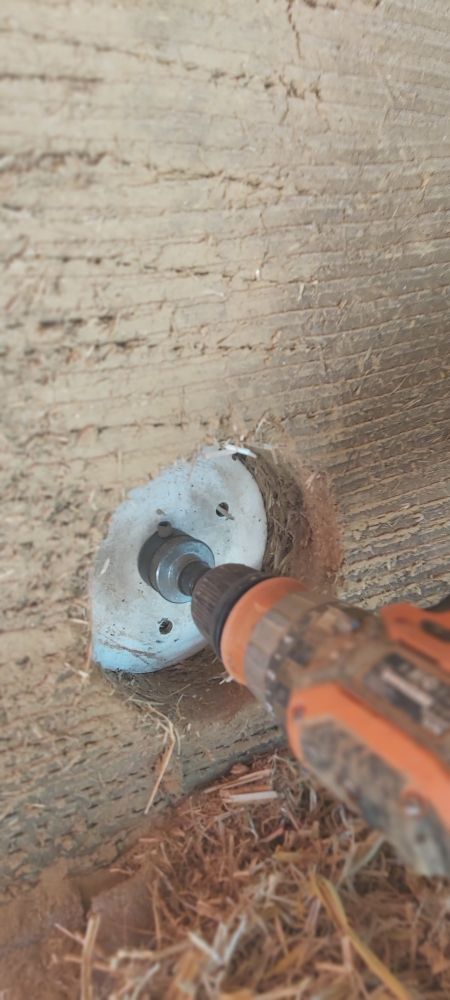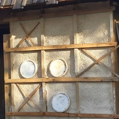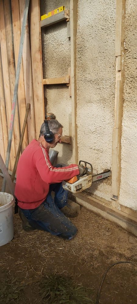 Sur ce mois de juin, nous réalisons les enduits de corps en terre. Une grosse partie est projetée, il s'agit de combler les endroits où il peut manquer de la matière et de redresser les murs.