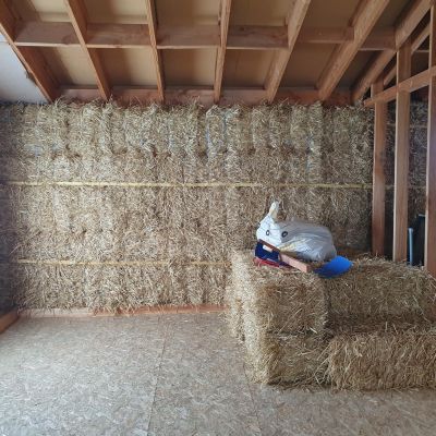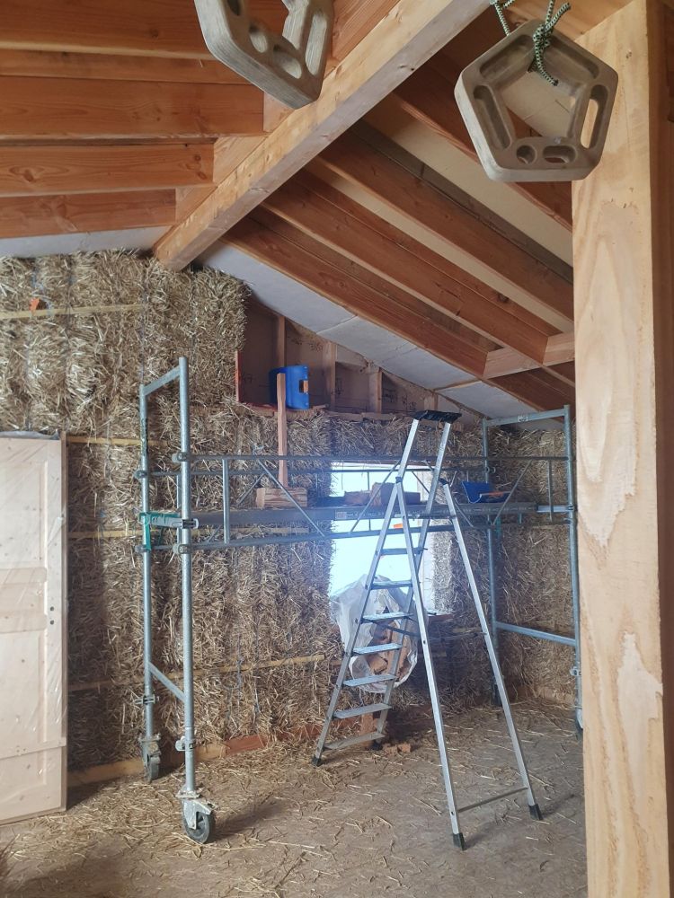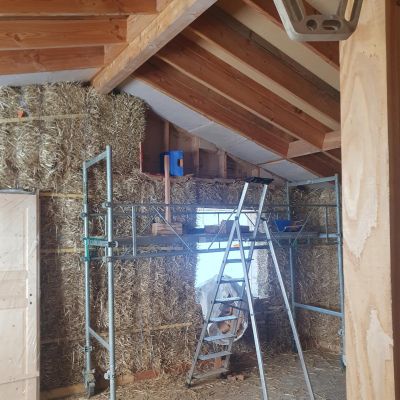 Ces chantiers porteront donc sur la mise en place de l’isolation en bottes de paille des murs extérieurs, puis enduit de corps, et la création des cloisons intérieures en terre-paille allégée.