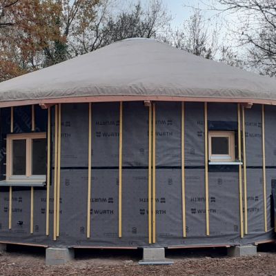 La pépinière demande des soins quasi quotidiens et puis, cela fait sens pour moi de vivre sur ma parcelle, près des mes bébés arbres, avec mes enfants humains et mon compagnon. Je construis donc une héliyourte ossature bois, avec bardage bois. Le chantier sera encadré par le constructeur de la maison et 2 de ses acolytes. Nous réaliserons la plateforme, les murs, le toit, l’isolation, la mezzanine intérieure et les cloisons. Il y a de quoi s’occuper !