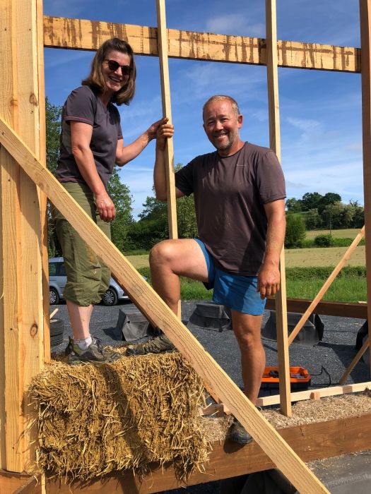 *Construction de murs avec bottes de paille et couche de corps en terre/paille.