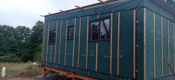Pose bacacier, portes, fenêtres, laine de bois, cloisons en contreplaqué, bardage bois ,carrelage, parquet et mise en place de l’électricité, de la plomberie, vmc,