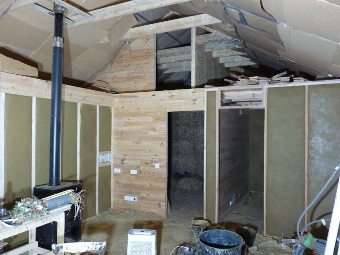 Je suis actuellement en train de construire un bâtiment agricole sur le terrain, en ossature bois, isolé en laine de bois pour le sol et le plafond et en paille pour les murs.