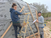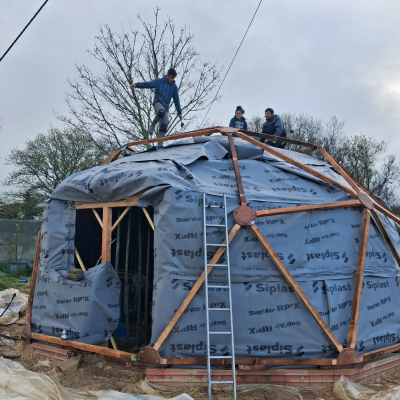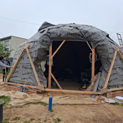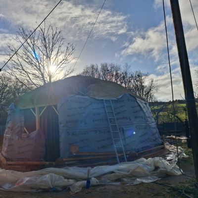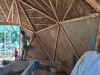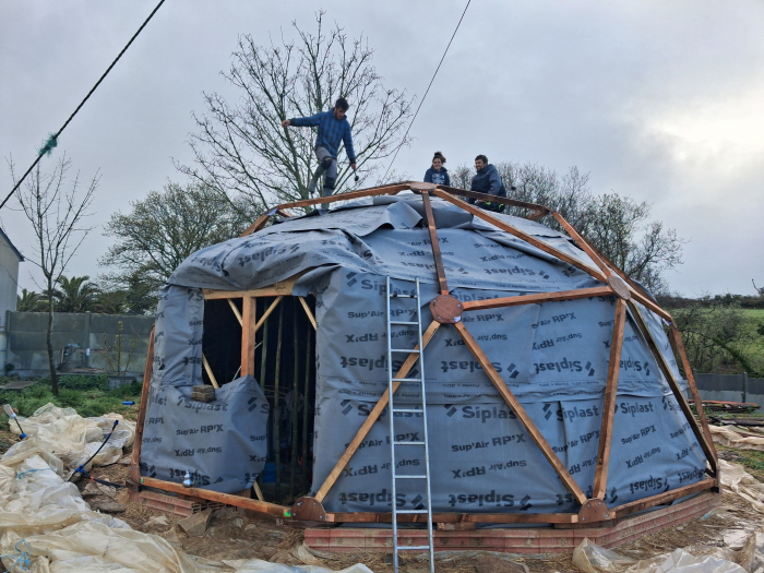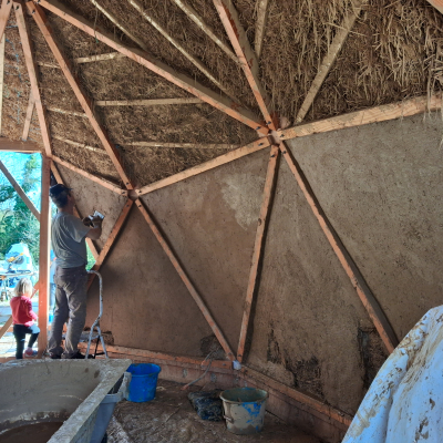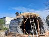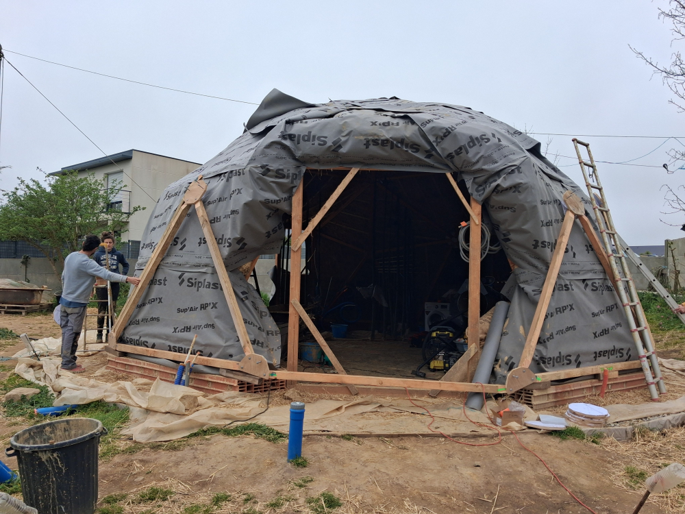 Le chantier recommence mi mars jusque fin avril pour la deuxième structure du dôme et la couverture; ainsi que l'intérieur plancher et au sol et création d’une salle de bain ( cloison, carrelage, enduit terre).