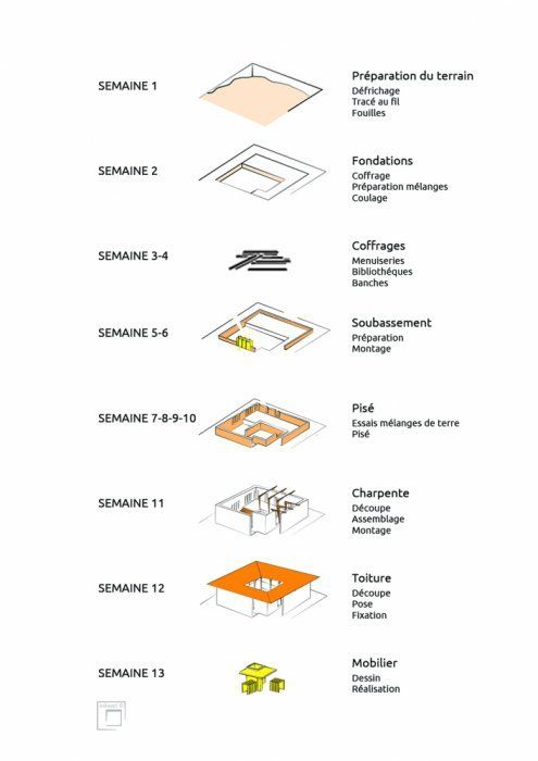 La bibliothèque étant à construire de A à Z, vous pourrez participer à différentes phase du projet : la réalisation des fondations, le montage des murs en pisé, la découpe de la charpente, la pose de la toiture ou encore les aménagements paysagers.