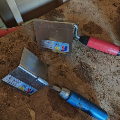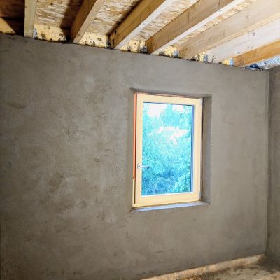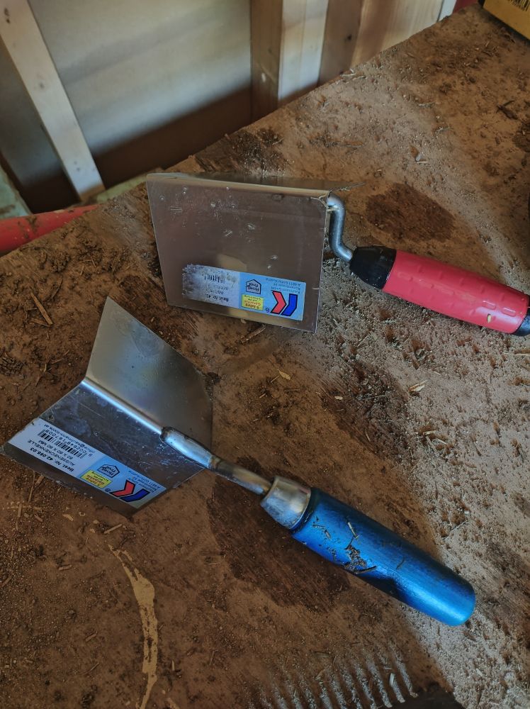 Préparation des surfaces en remplissant chaque interstices avec des poupées de paille, tamisage de la terre du terrain, test de formulation d'enduit, barbotine, et corps d'enduit en terre crue !