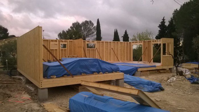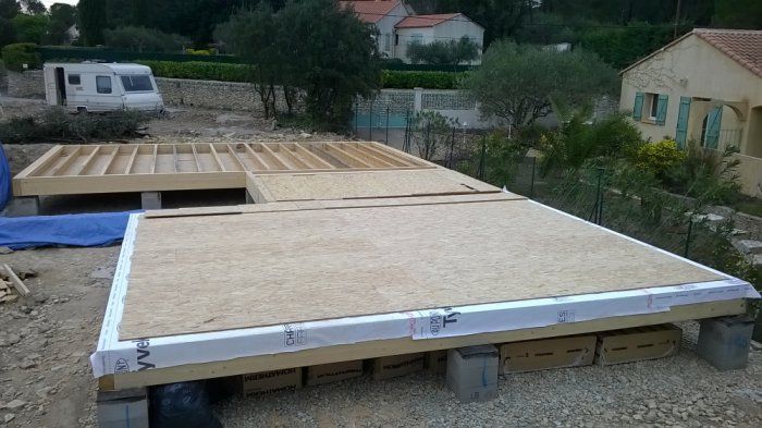 - montage d'une dalle auto-porteuse en bois (poutres en I, isolation en laine de bois, pare-vapeur) sur plots béton,