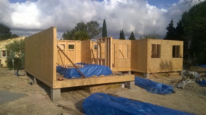 - montage des murs ossature bois, mise en place du pare-pluie, des liteaux et du bardage vertical,