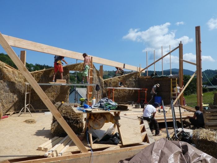 Il s'agira ici de commencer à monter des murs d'une maison en double hexagone, de les recouvrir de l'enduit de corps, de poser des vitres et/ou des menuiseries et commencer la construction du toit en double pente qui sera également isolé en paille.