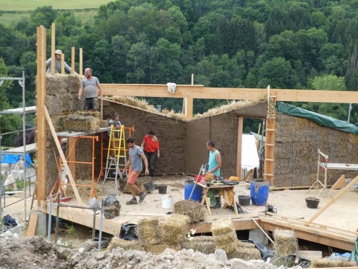 Construction d'une maison en paille et terre selon la méthode Cellule Sous Tension de Tom Rijven.