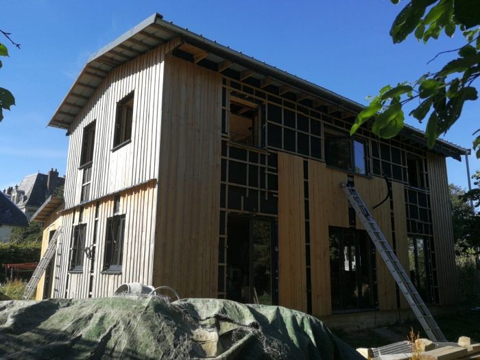 Fondations cyclopéennes, sous-bassements, hérisson, dalle chaux liège, ossature greb, toit monopente avec poutres en I, remplissage des murs et de la toiture avec des bottes de paille, mortier greb pour protéger la paille, bardage douglas à l'extérieur, enduit terre à l'intérieur.