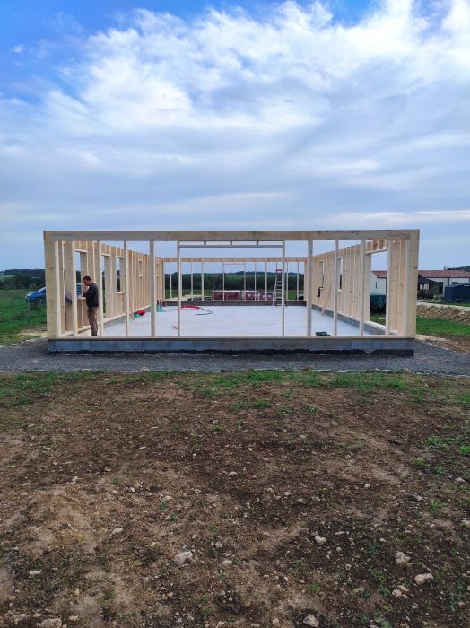 Le chantier débute le 12 octobre 2022 avec des étapes plus importantes (selon la météo). Les 14 et 15 assemblage des fermettes. Aux environs du 22, montage des fermettes et du platelage. Entre temps il y aura le montage des portions de murs à assembler sur la dalle et après la mise en place du pare vent et du pare pluie avant le beau bardage bois. Éventuellement la pose des tuiles (hé oui ! nous en avons trouvé !)