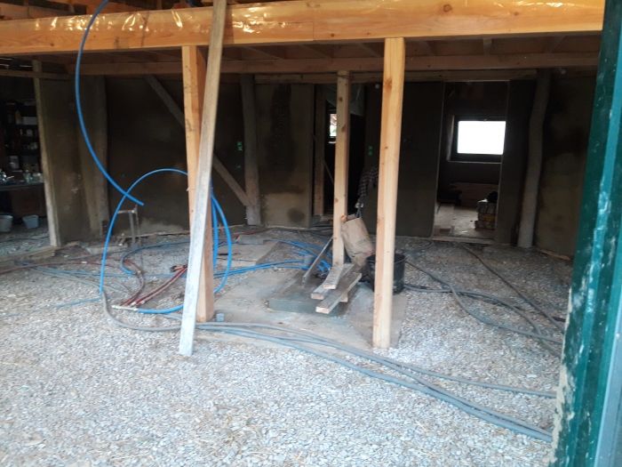 Actuellement hors d'eau (provisoirement, un chantier d'isolation du toit et de couverture sera réalisé cet été) et d'air nous sommes actuellement sur la plomberie et l'électricité, avant d'attaquer le banchage (en terre-paille) des cloisons intérieures et la pose du plancher de la mezzanine. (deux paires de bras bienvenues dès aujourd'hui )