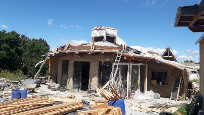 En juillet-aout gros chantier d'isolation (en paille) et couverture (EPDM sur lame d'air) pour être hors d'eau pour de vrai.