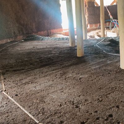 Isolation du sol avec Misapor et dalle en terre on a envie mais j'hésite encore pour les pièces humides à ajouter de la chaux et/ou mettre autre chose. La réflexion est en cours et j'en suis pas encore au stade des enduits mais on y arrive assez vite. Et sur tout ça, une toiture végétalisée semi-extensive.