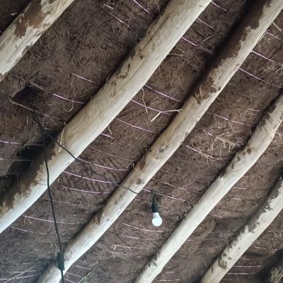 On est à 120m² au sol environ mais avec une serre/véranda (POUR MOI et mes plantes !!! trop contente !) de 14m², donc c'est pas peu, mais c'est pas trop pour 4! Bon en tout cas 13m de diamètre en charpente réciproque, ça fait des perches un peu trop balaises et pas faciles à mettre en œuvre d'où le rond dans un rond. Le petit rond (pièce centrale) en poteaux poutre et charpente réciproque et le grand rond en paille porteuse avec une charpente radiale qui se reprend sur le poteaux poutres.