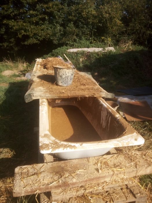 ultérieurement ce trou deviendra une mare. Elle sera approvisionnée en eau de pluie provenant du toit de la grange. Les terres agricoles avoisinantes, d'où viennent les bottes de paille, sont cultivées en bio. Un de mes voisins est un producteur de lait bio, j' envisage éventuellement de fabriquer du beurre barraté à l'ancienne.