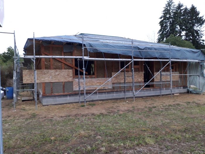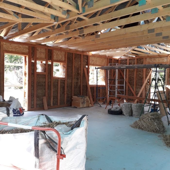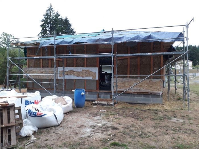 Mi-juillet nous avons démarré la construction de notre maison accompagnée par l’association Approche paille en accueillant 15 stagiaires et 2 formateurs pour le stage « Construire en paille avec la technique du Greb ». Pendant ce stage, 2 murs en ossature bois ont été montés.