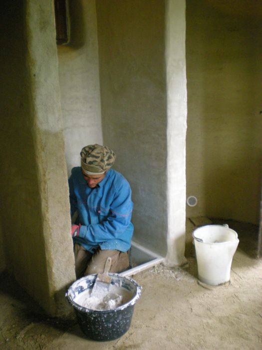 enduits extérieur puis intérieur, installation du poêle chauffant par le sol, damage et finition du sol en terre battue, aménagements intérieurs, arrivée de l'eau, coin cuisine et douche. Enduit tadelakt pour la douche, besoin d'aide pour ça d'une personne expérimentée.