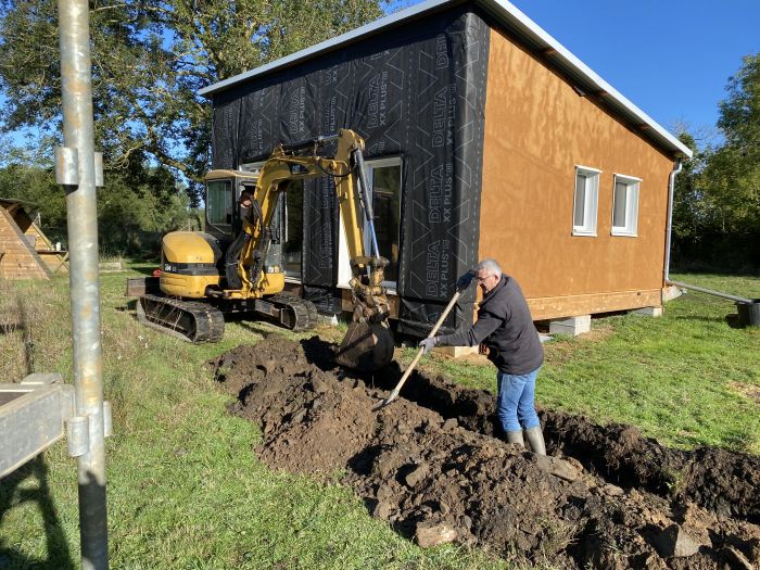 La maison sera sur plot, sur une dalle bois et en ossature bois, isolée en paille et enduite en terre. Nous privilégions une vie à l'extérieur et voulons minimiser nos besoins énergétiques, ce sera donc une micro maison (33m² isolé, 55m² de surface plancher).