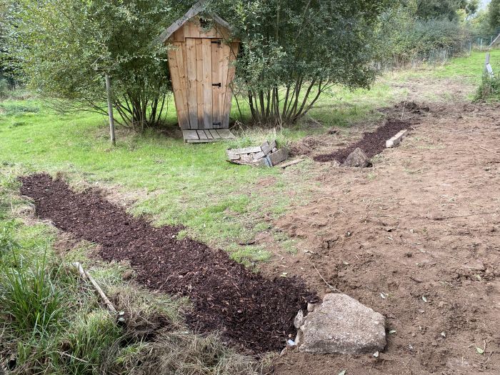 Un verger jardin a vu le jour, renforcement de la haie bocagère, plantation de fruitiers et d’arbre du bocage (toujours en cours), et un aménagement en permaculture à terme.