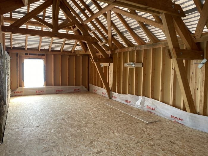 Après un travail remarquable de maçonnerie, aujourd’hui ce sont Mathurin, Kévin et Christophe qui s’affairent sur la charpente et l’ossature bois de l’extension.