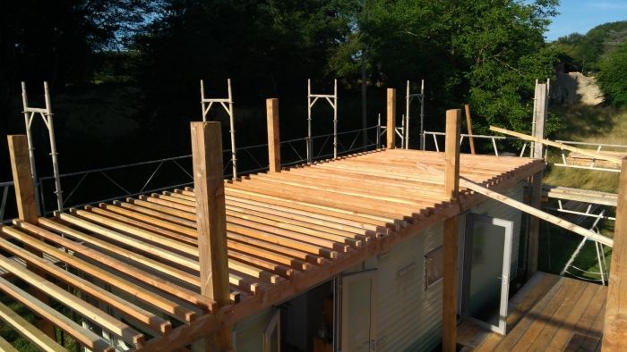 Au cours de l’été, nous passerons à différentes autres structures bois (sanitaires extérieurs + toilettes sèches mobiles + abri jardin). Tout ça en bois. Été « mikado » en quelques sortes :-)