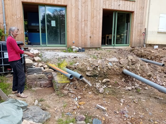 Avec les pierres locales (granit, schiste, quartz, ardoise, etc) récupérées du mur sud de la maison, on a commencé à construire pierre à pierre le mur de soutènement de la terrasse, en réservant la place d'une citerne de récupération des eaux pluviales ; il y aura un escalier, tout en pierre aussi, pour descendre de la terrasse au jardin. Il reste à réaliser la longueur de façade du mur avec l'escalier et les deux angles avec les côtés de la terrasse.