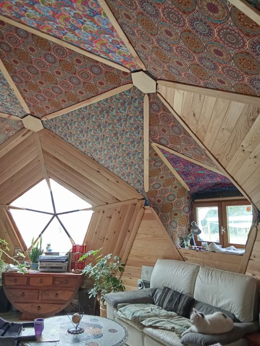 En attendant de vivre dans la maison nous avons entrepris de nous construire un petit nid dans le jardin par l’installation d’un dôme géodésique de 28m2. Le dôme est en ossature bois et sera isolé en botte de paille.