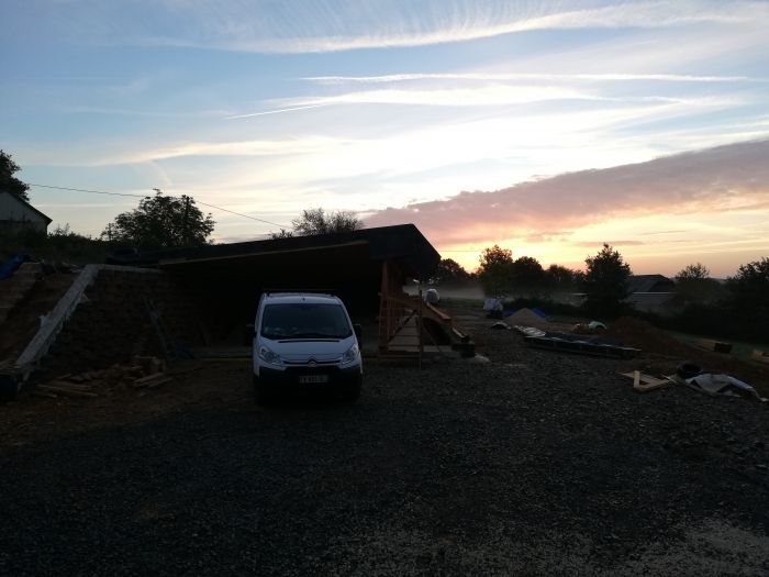 Nous visons un maximum d'autonomie à l'issue de notre chantier. C'est la raison pour laquelle nous placerons ensemble des cuves de récupération d'eau pluviale afin de revaloriser cette source naturelle, nous mettrons en place un puit canadien pour assainir et ventiler notre air, nous profiterons de l'énergie du soleil avec une installation photovoltaïque et son parc batterie et surtout nous construirons ensemble un Earthship inspiré aux qualités bioclimatiques. A cette occasion nous revalorisons de nombreux pneus usagés pour établir notre mur principal de soutènement qui sera recouvert d'enduit naturel terre/paille ainsi qu'un second mur drainant en amont. L'ossature restante ainsi que la charpente seront en bois. L'une permettra d'accueillir une verrière au sud et l'autre un toit monopente en bacacier (isolation en ouate de cellulose). Nous poserons un chauffe eau autonome thermique et bois.